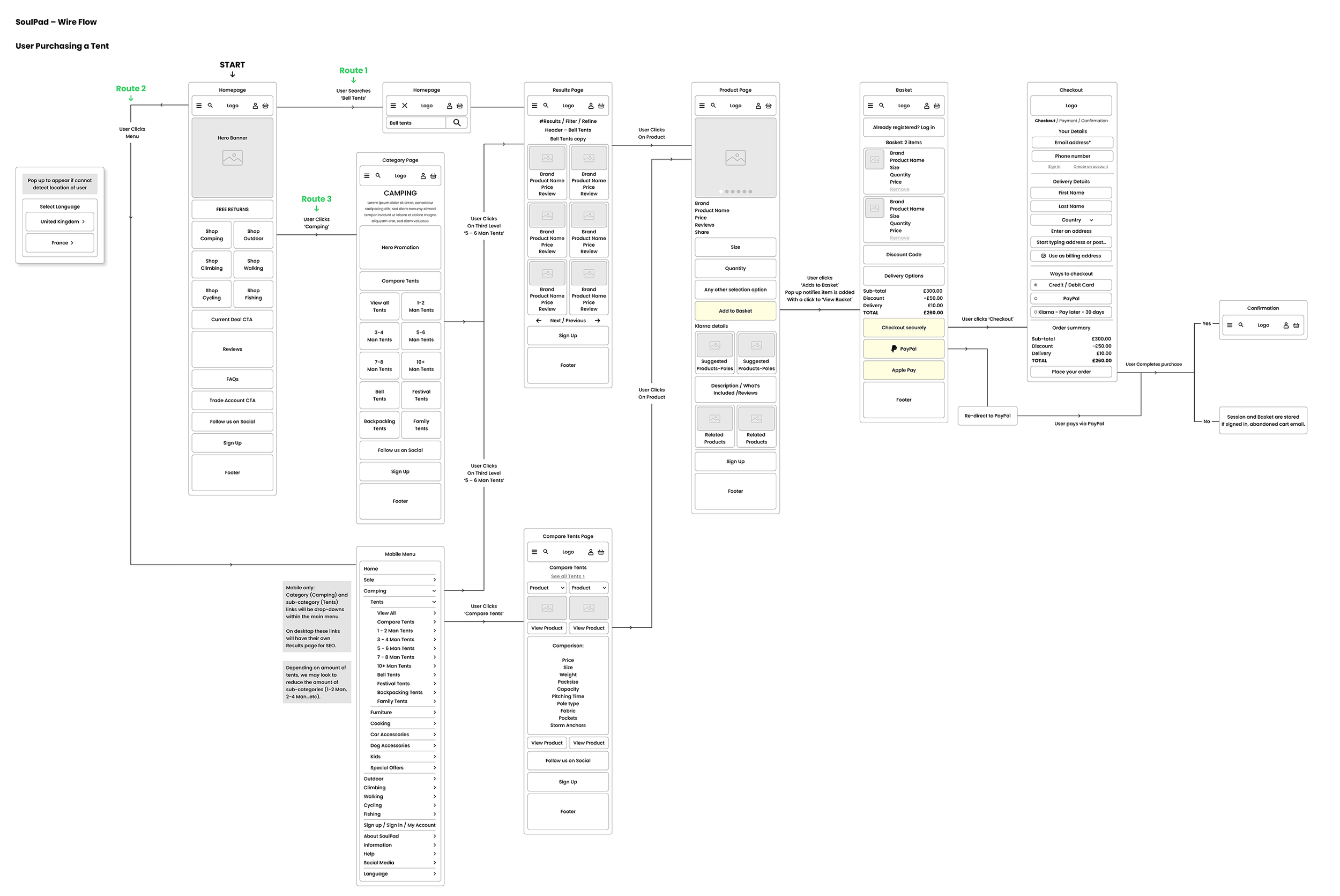 From the wireframes, I set out and created a user flow around a user purchasing a tent. The idea was to keep this process as simple as possible for a user but also to give them multiple ways to reach the same destination.